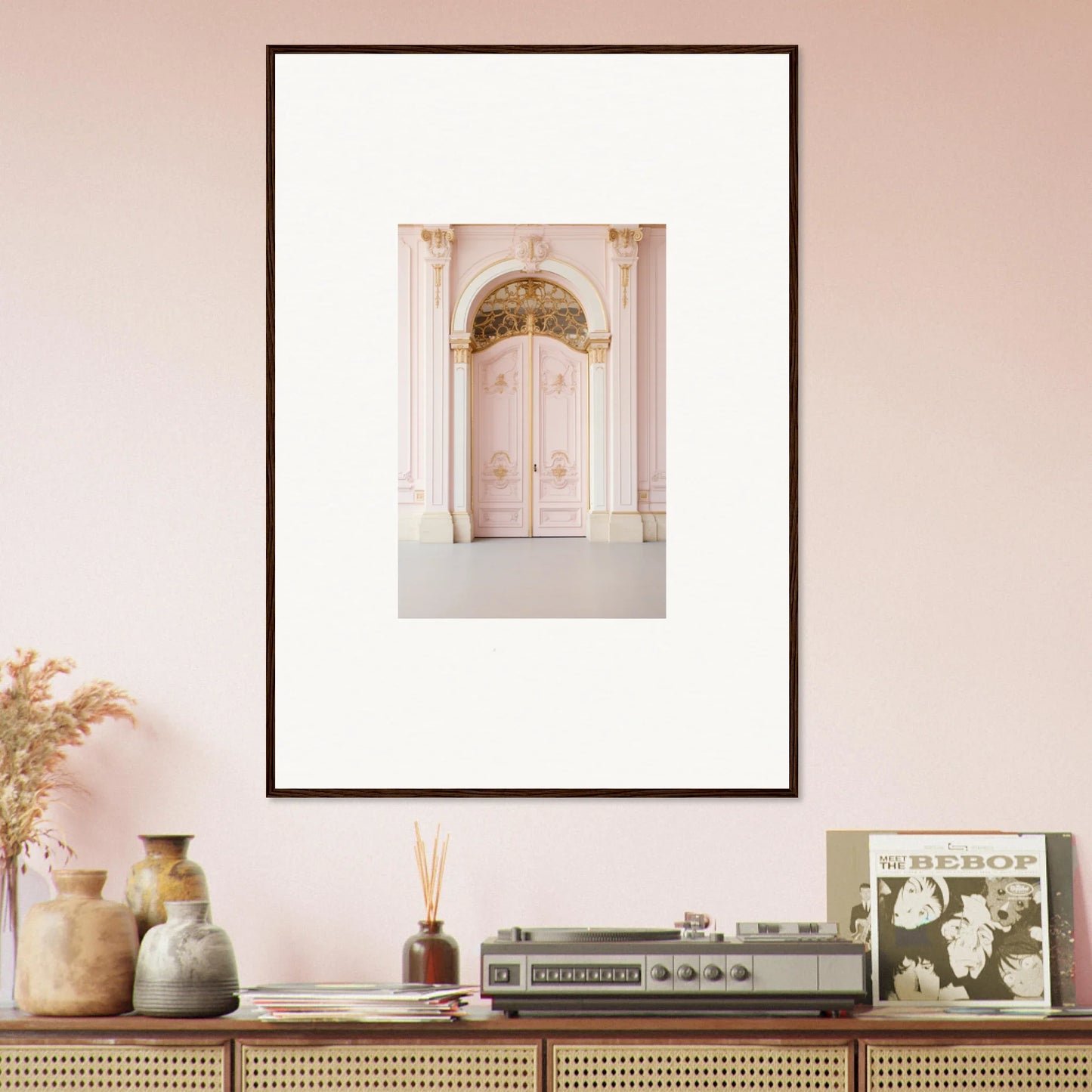 The "Regal Must" framed wall art brings an elegant touch to any room, with its soft pink hue and gold accents. This piece exudes a mood of luxurious style and serenity, making it perfect for creating a peaceful sanctuary in your bedroom or a refined focal point in your living room. The classic art style and the architectural elements of the composition are enhanced by the expressive margins, ensuring an eye-catching display.