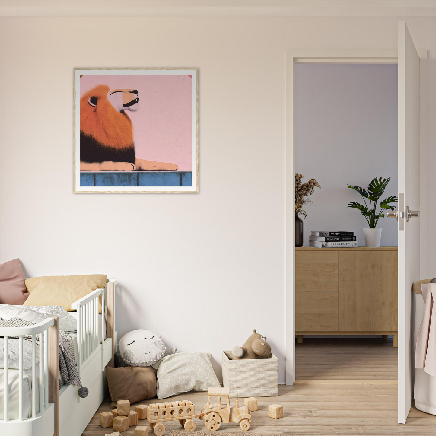 Each frame is a testament to superb craftsmanship, carved from ethically sourced woods. The available tones, including natural, black, and white, are designed to complement the tranquil yet vibrant artistic narrative of your lion.