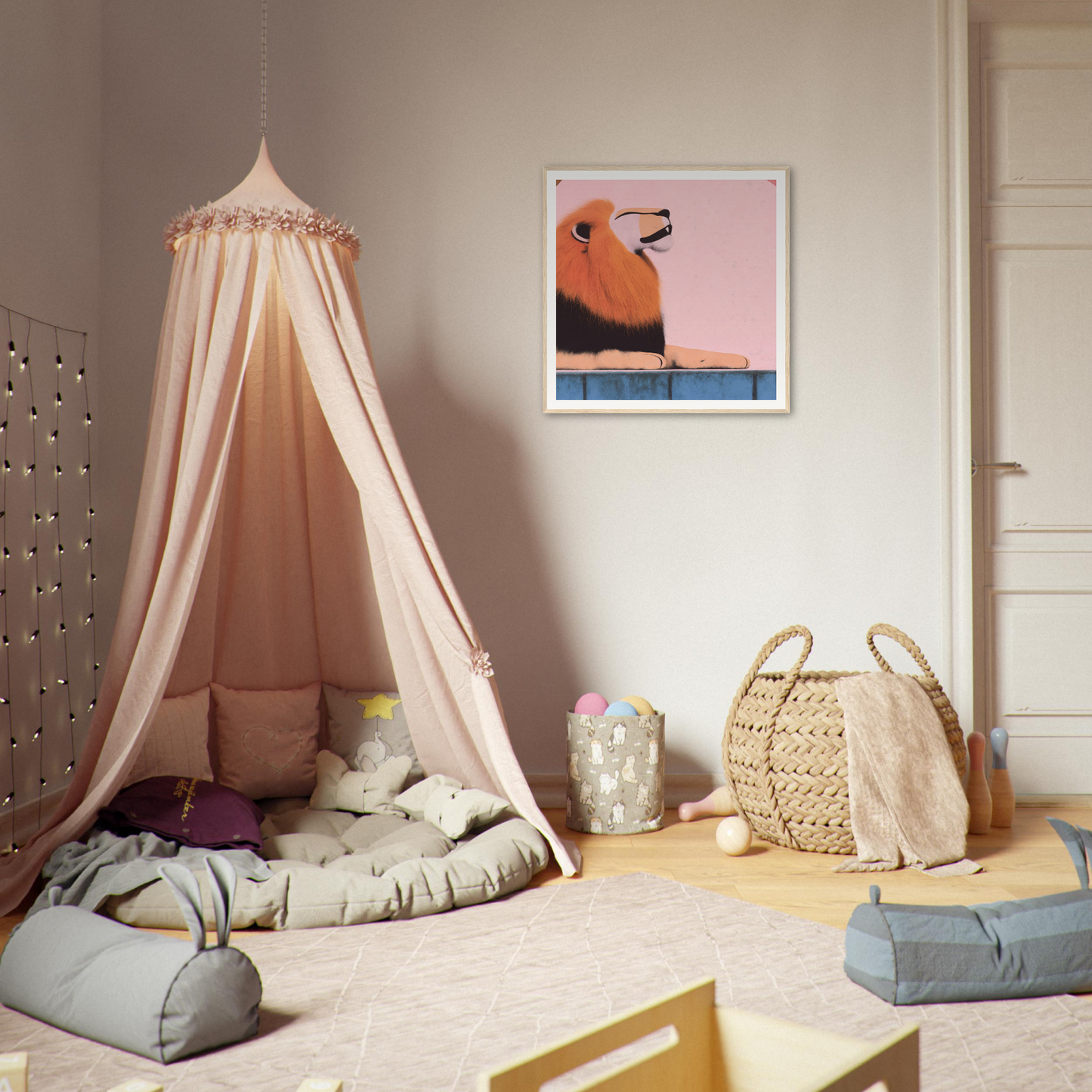 Our print medium offers a superior canvas, bringing the lion's vibrant orange mane and the soft pink backdrop to life. The precision and detail assure that every viewer is drawn into the powerful narrative of introspection and strength serenely depicted.