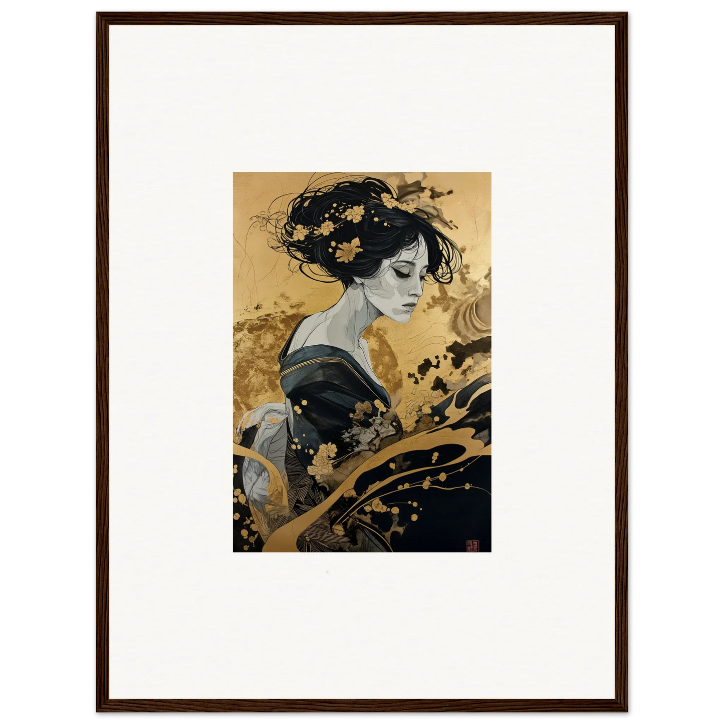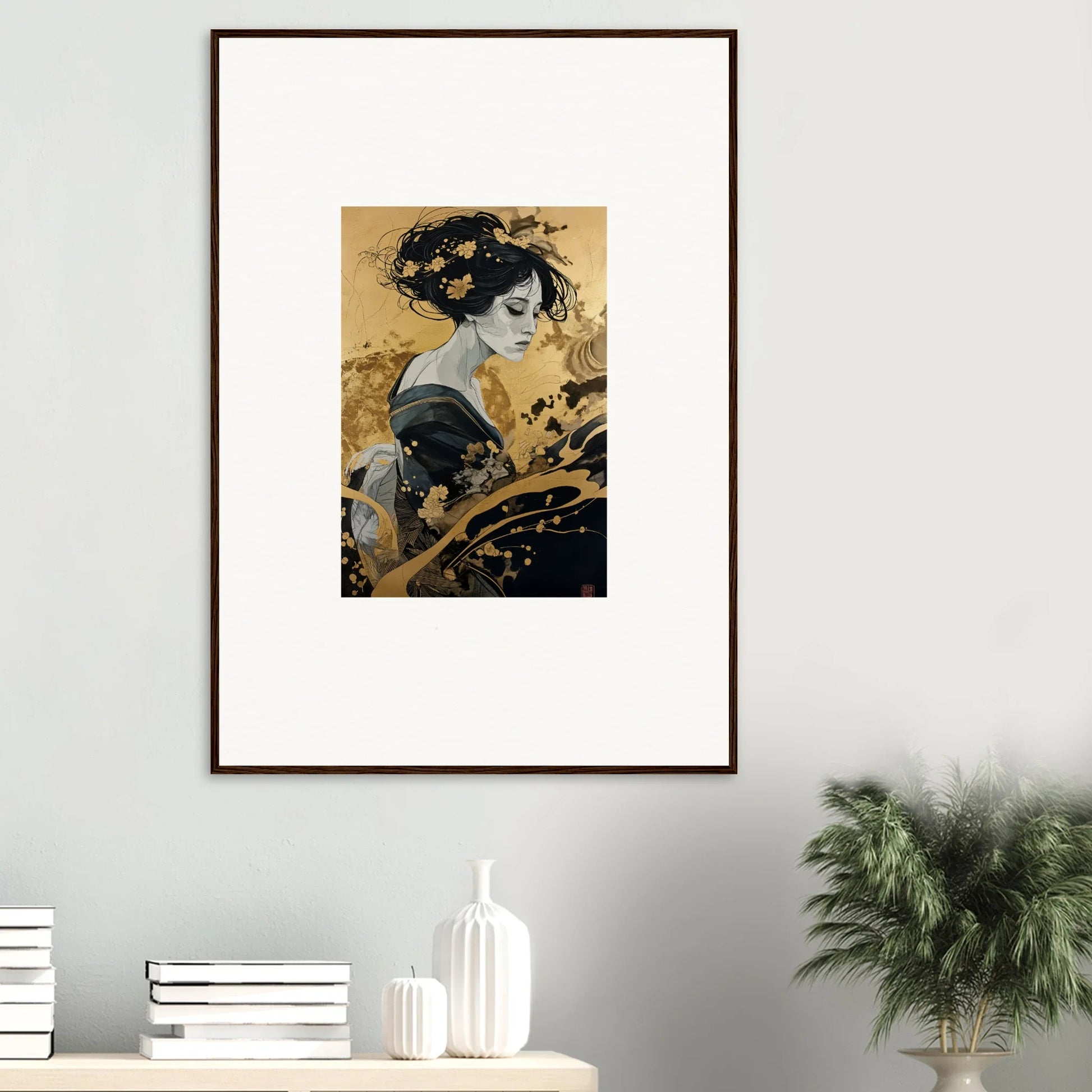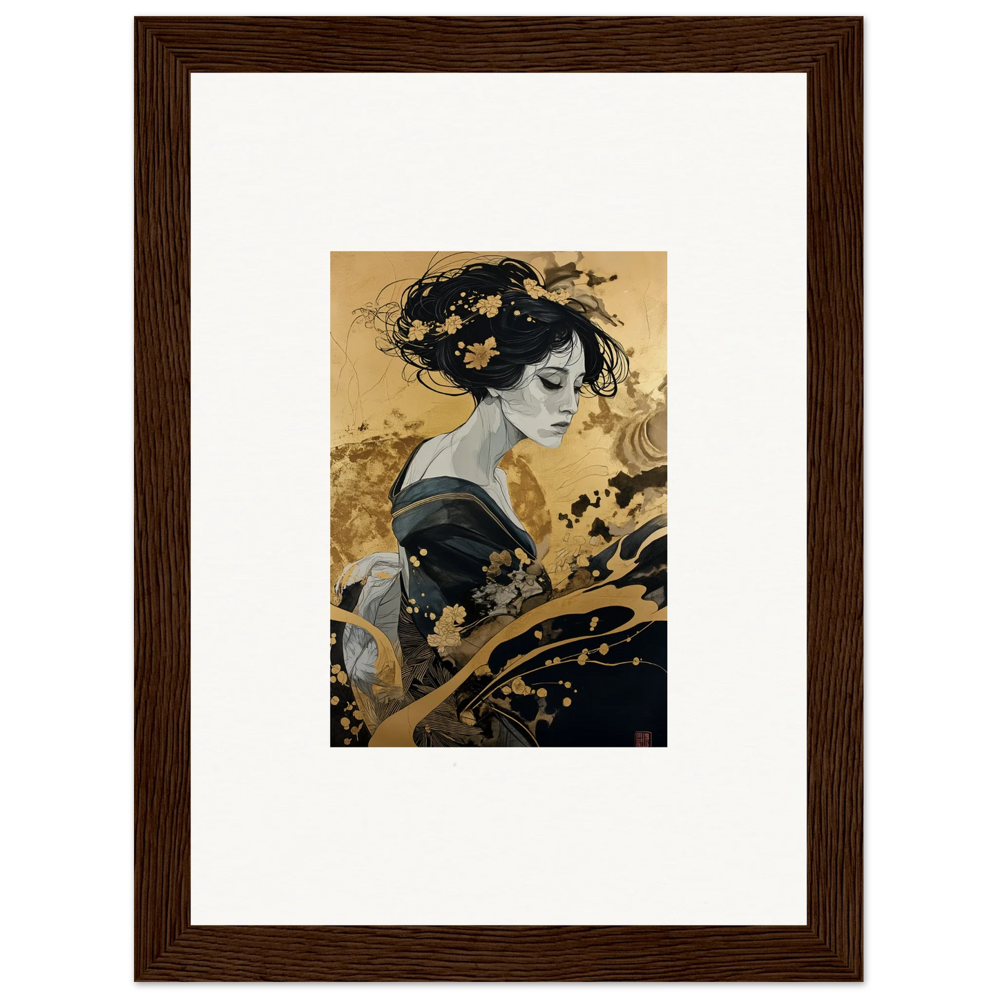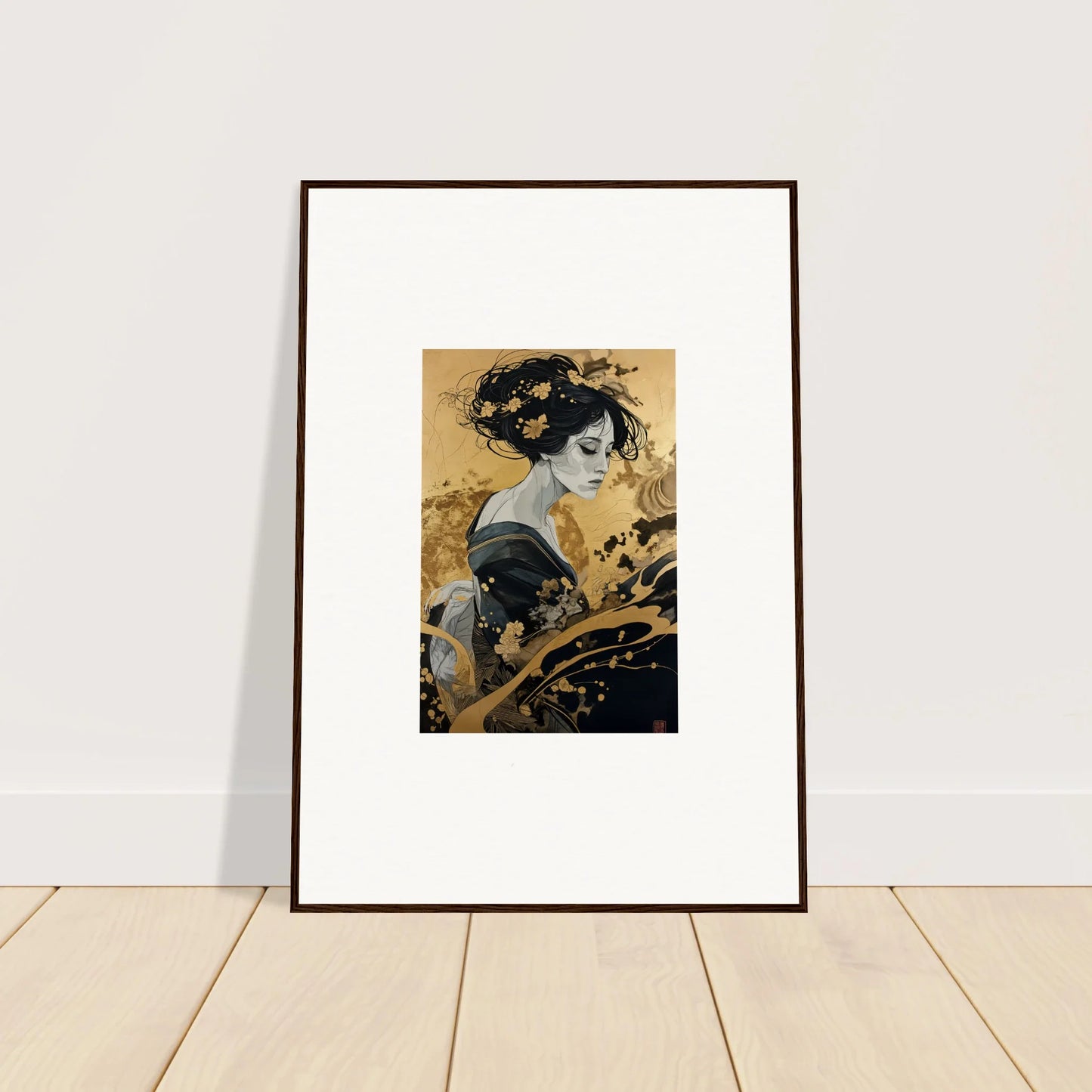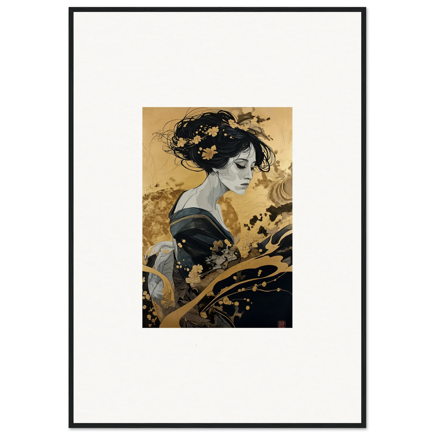 Our framed wall art “Solitude's Golden Elegance” draws heavy inspiration from traditional Japanese art. The figurative subject, depicted in a fashion emblematic of Japanese culture, resonates with both mystery and intrigue. The harmonious blend of black and gold offers a complementary color palette that adds a touch of sophistication to any room—be it a bedroom or living room. This piece is designed to be creative and inspiring, perfect for any modern interior.