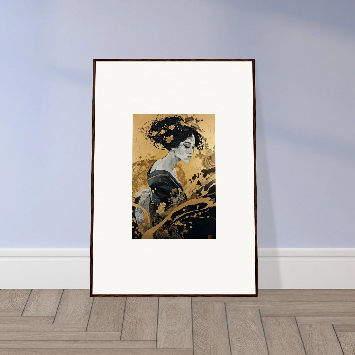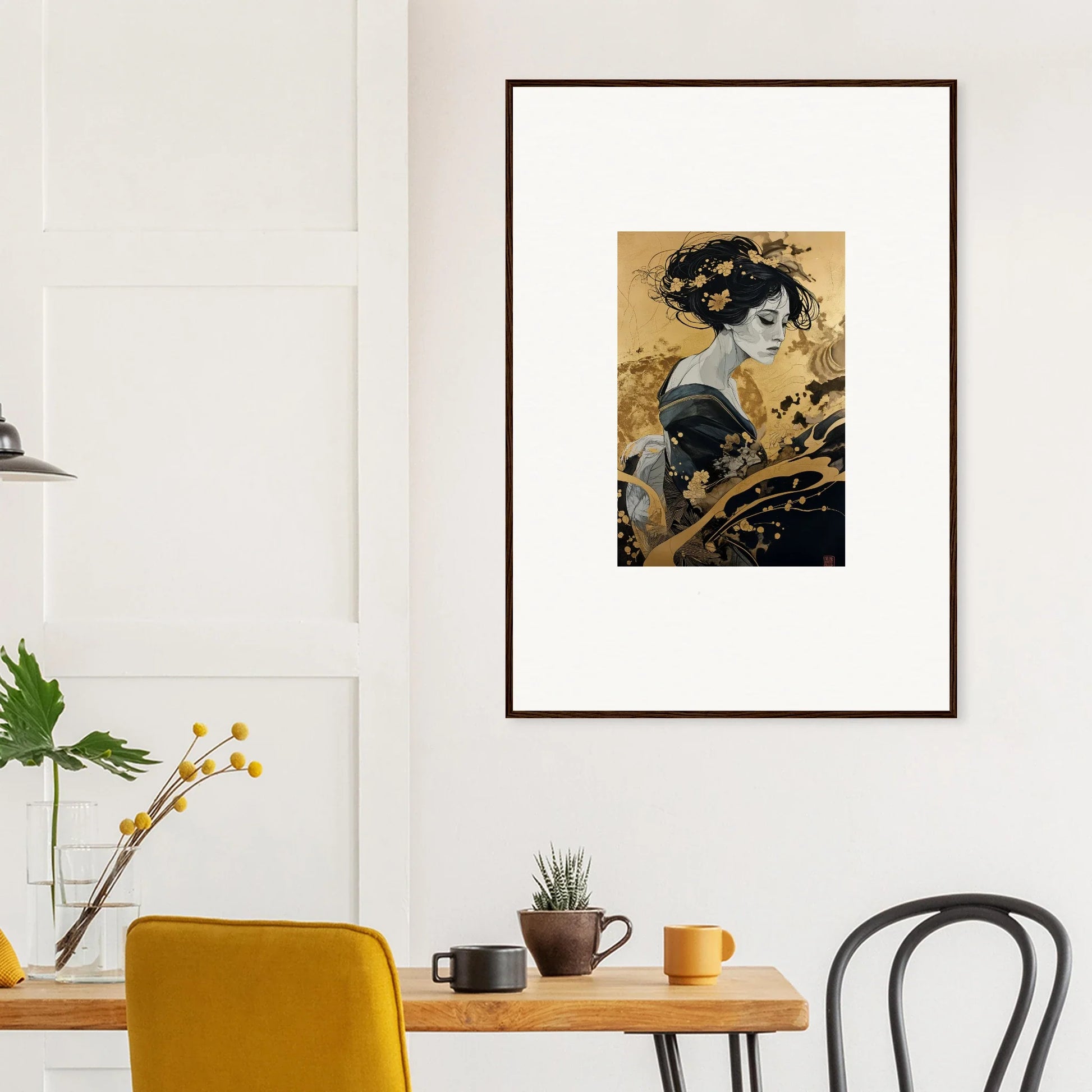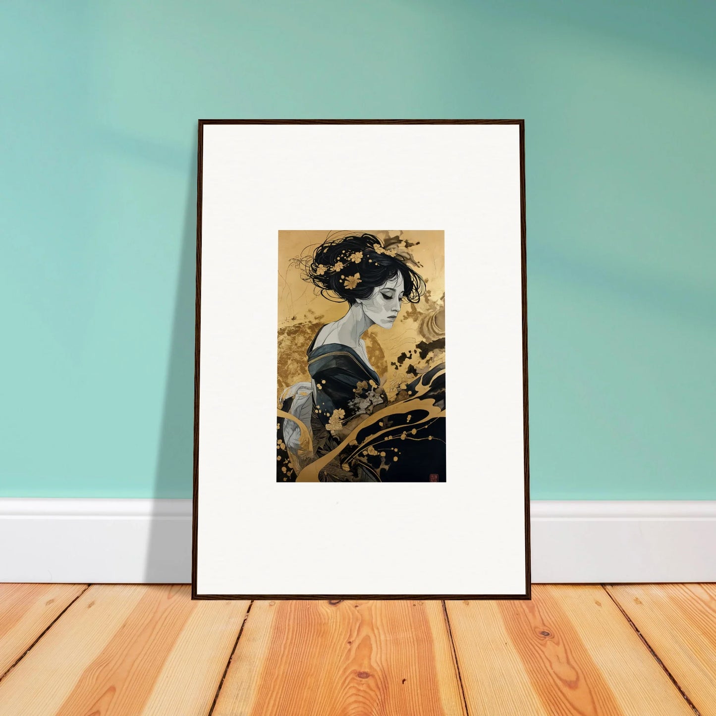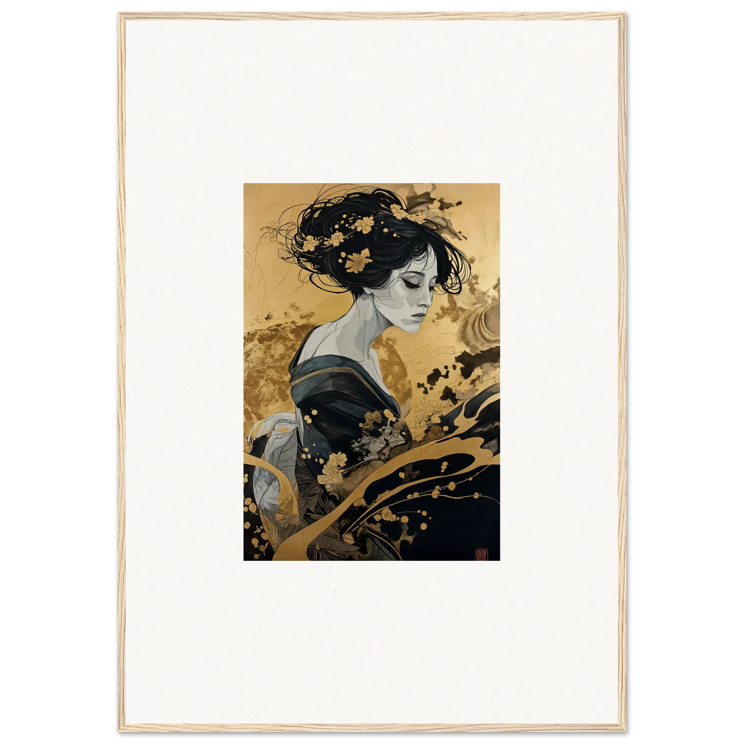 Our framed wall art “Solitude's Golden Elegance” draws heavy inspiration from traditional Japanese art. The figurative subject, depicted in a fashion emblematic of Japanese culture, resonates with both mystery and intrigue. The harmonious blend of black and gold offers a complementary color palette that adds a touch of sophistication to any room—be it a bedroom or living room. This piece is designed to be creative and inspiring, perfect for any modern interior.