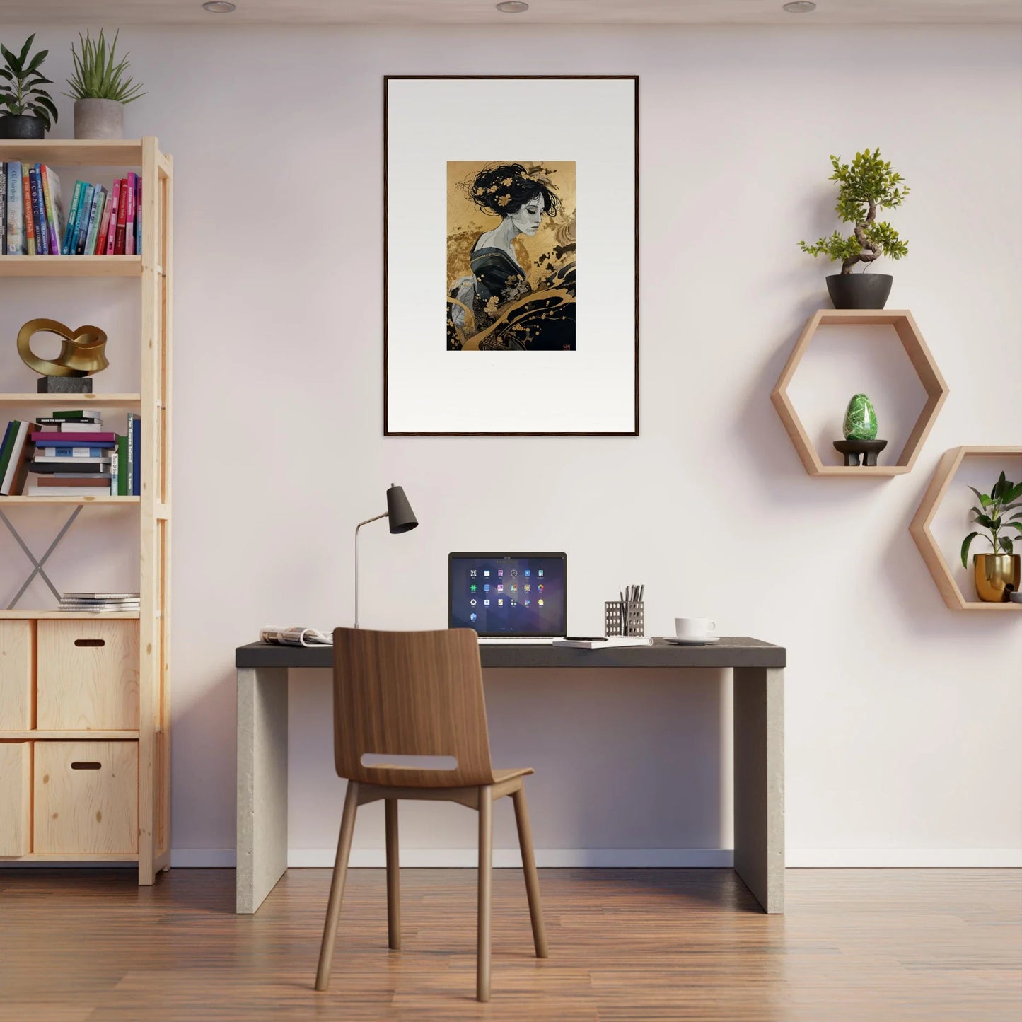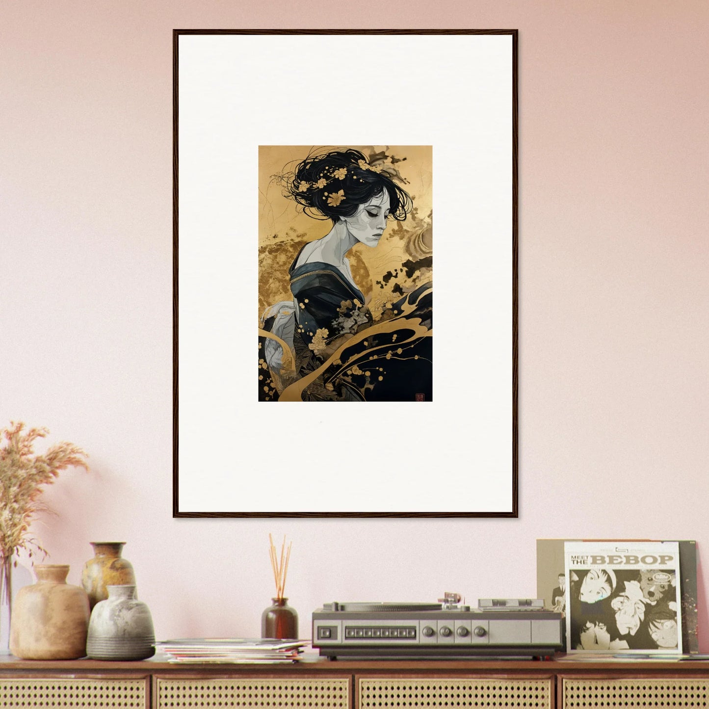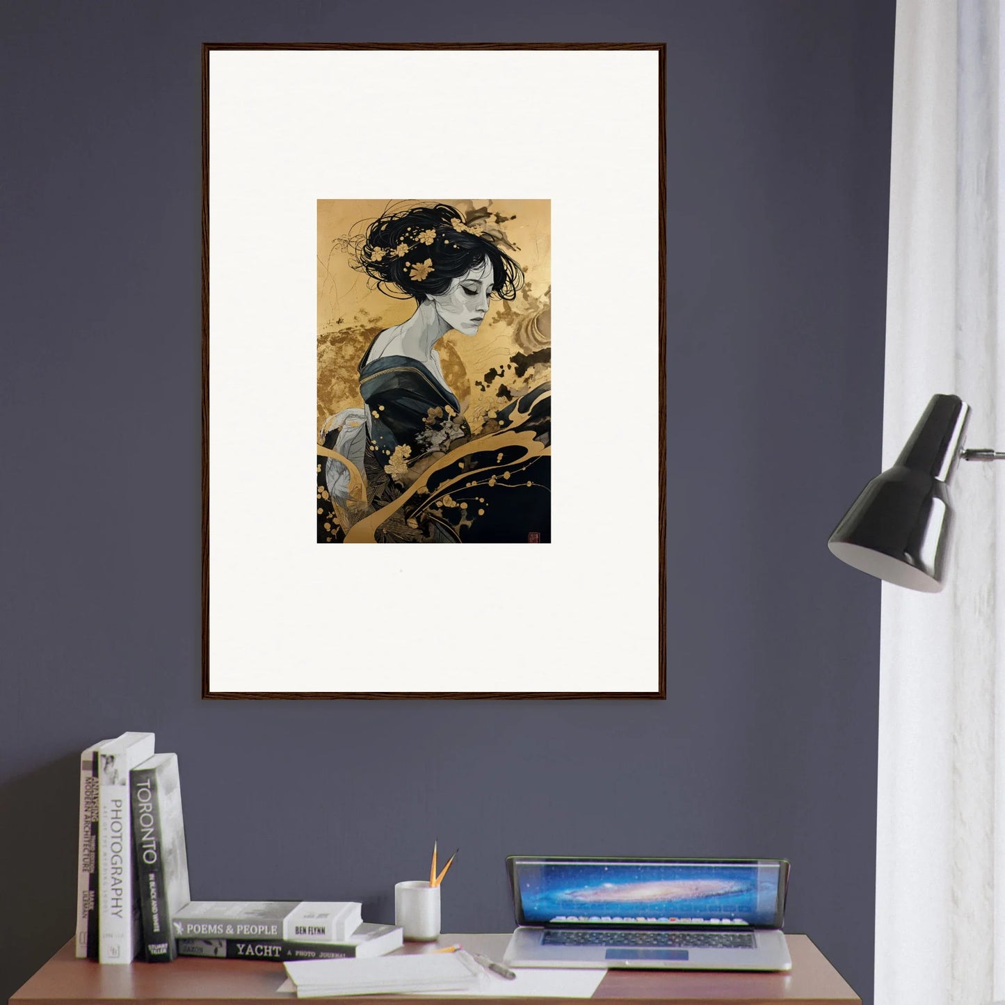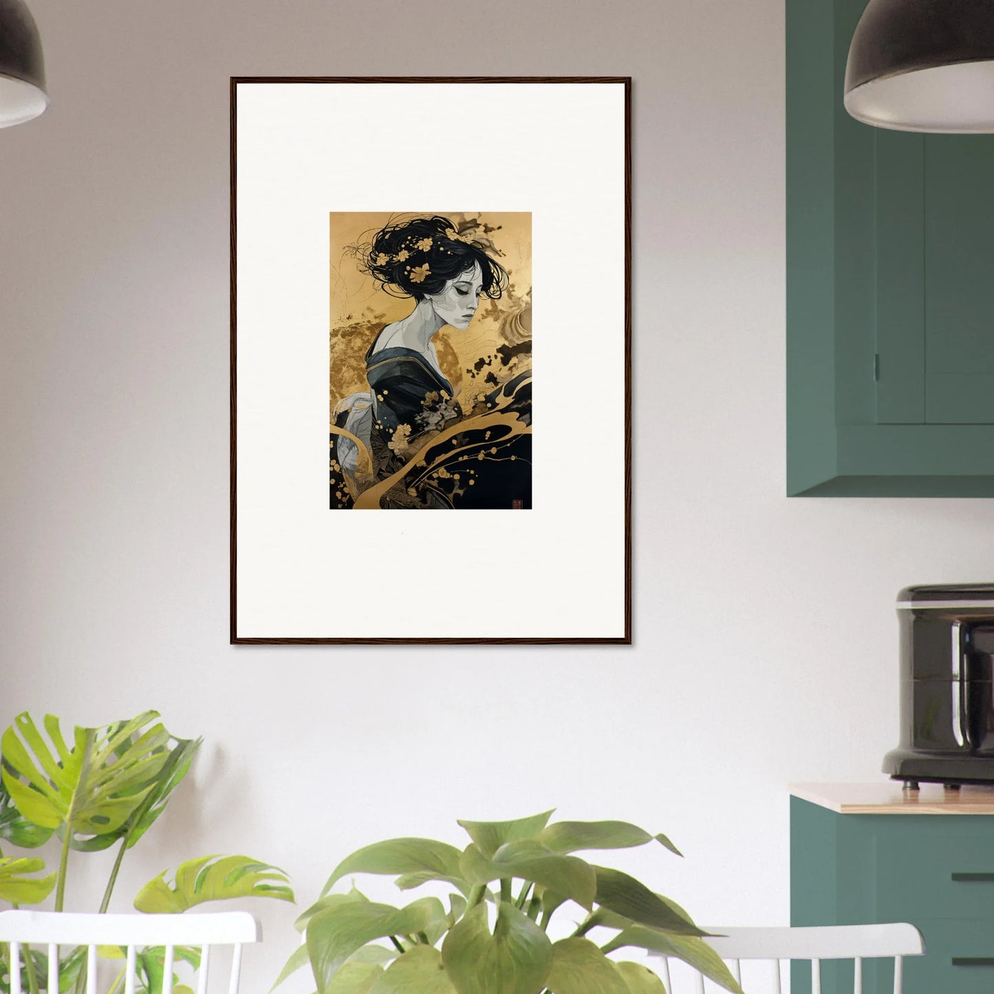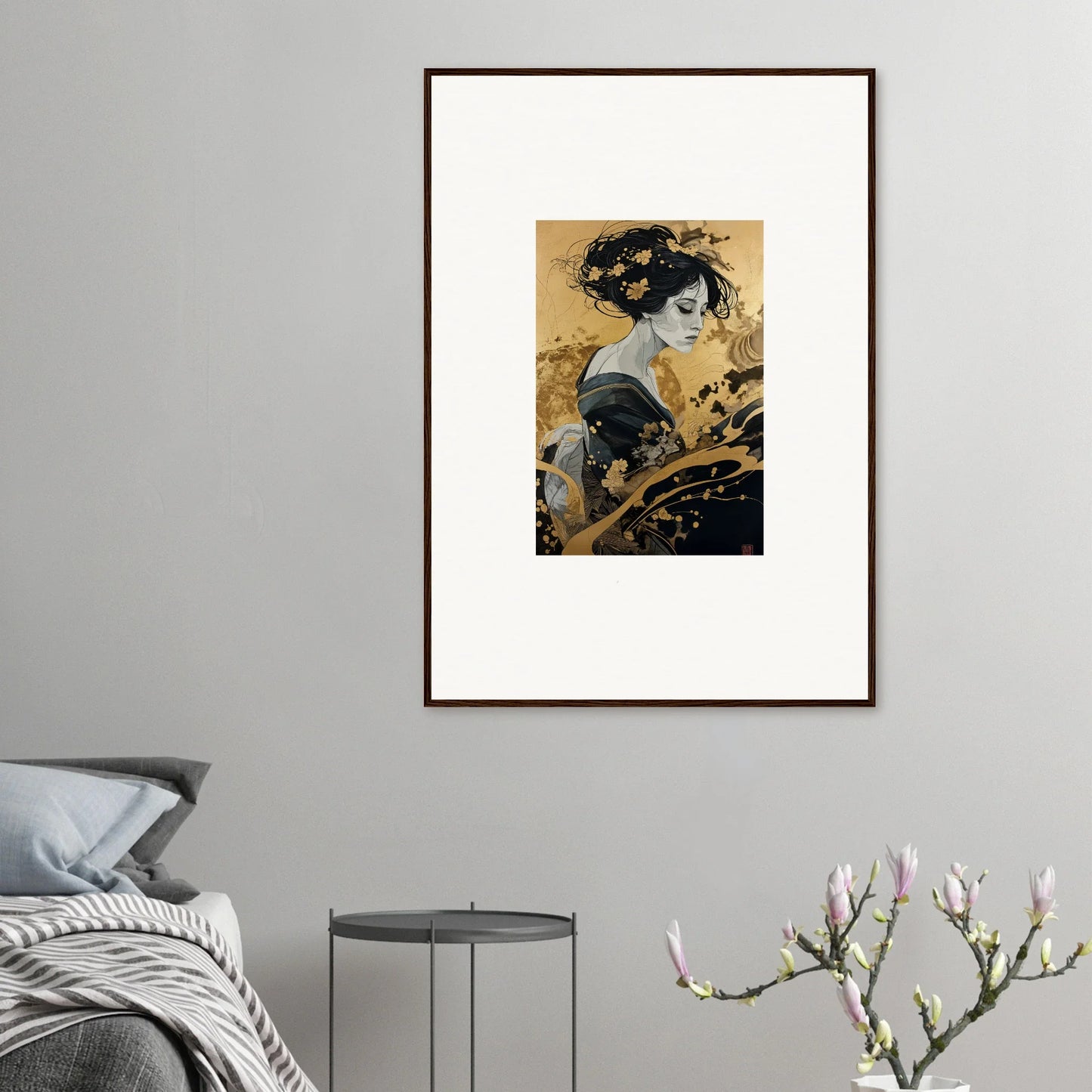 Our framed wall art “Solitude's Golden Elegance” draws heavy inspiration from traditional Japanese art. The figurative subject, depicted in a fashion emblematic of Japanese culture, resonates with both mystery and intrigue. The harmonious blend of black and gold offers a complementary color palette that adds a touch of sophistication to any room—be it a bedroom or living room. This piece is designed to be creative and inspiring, perfect for any modern interior.