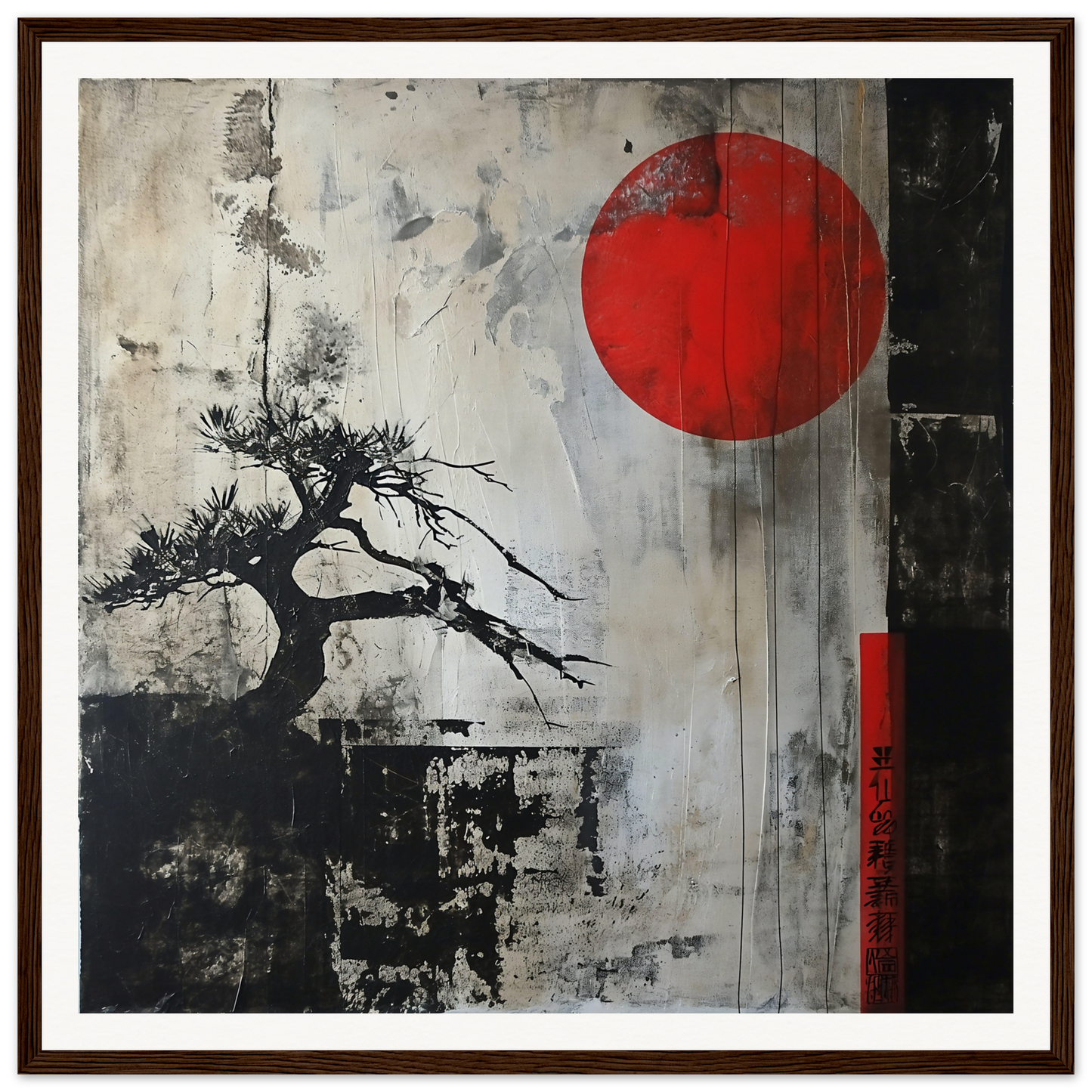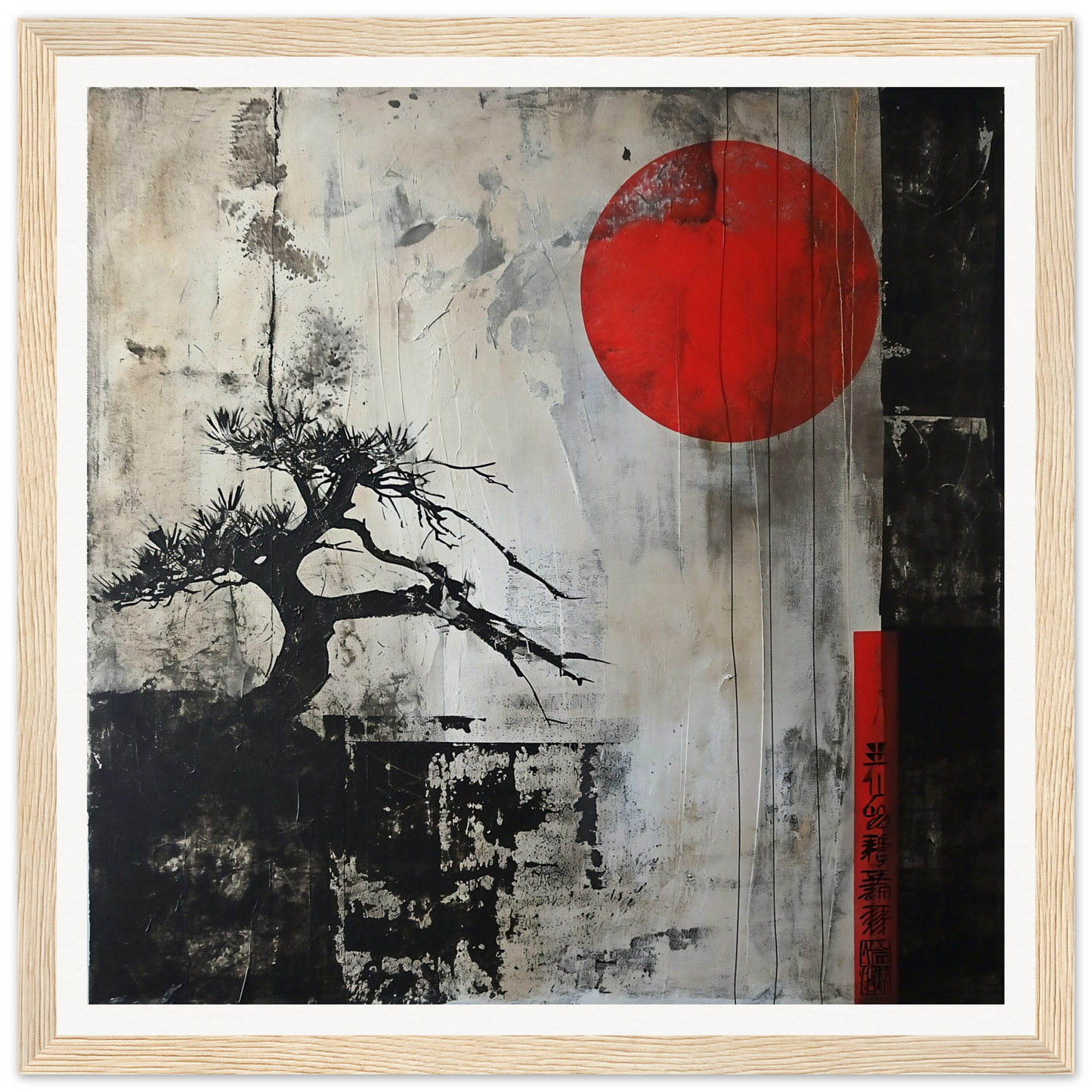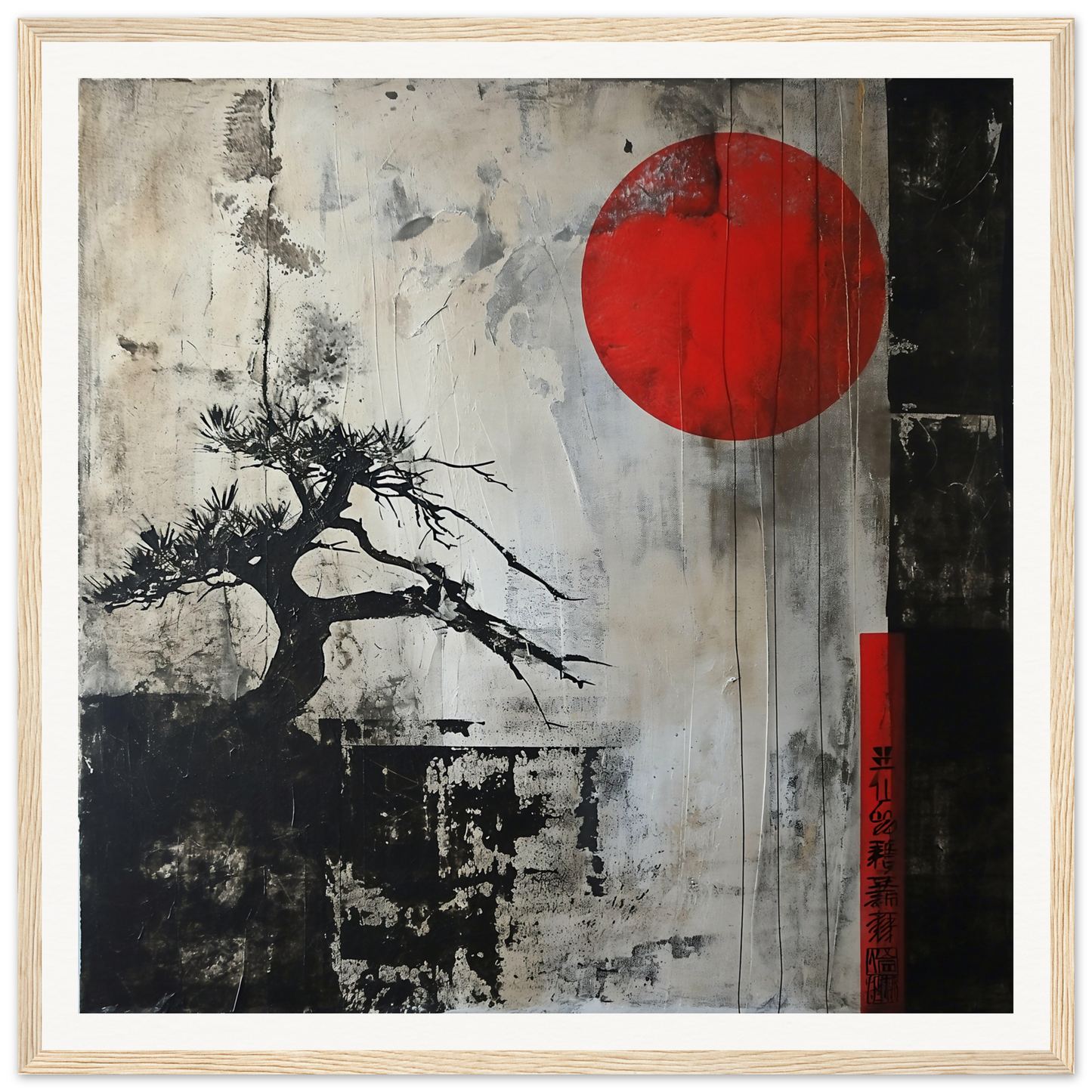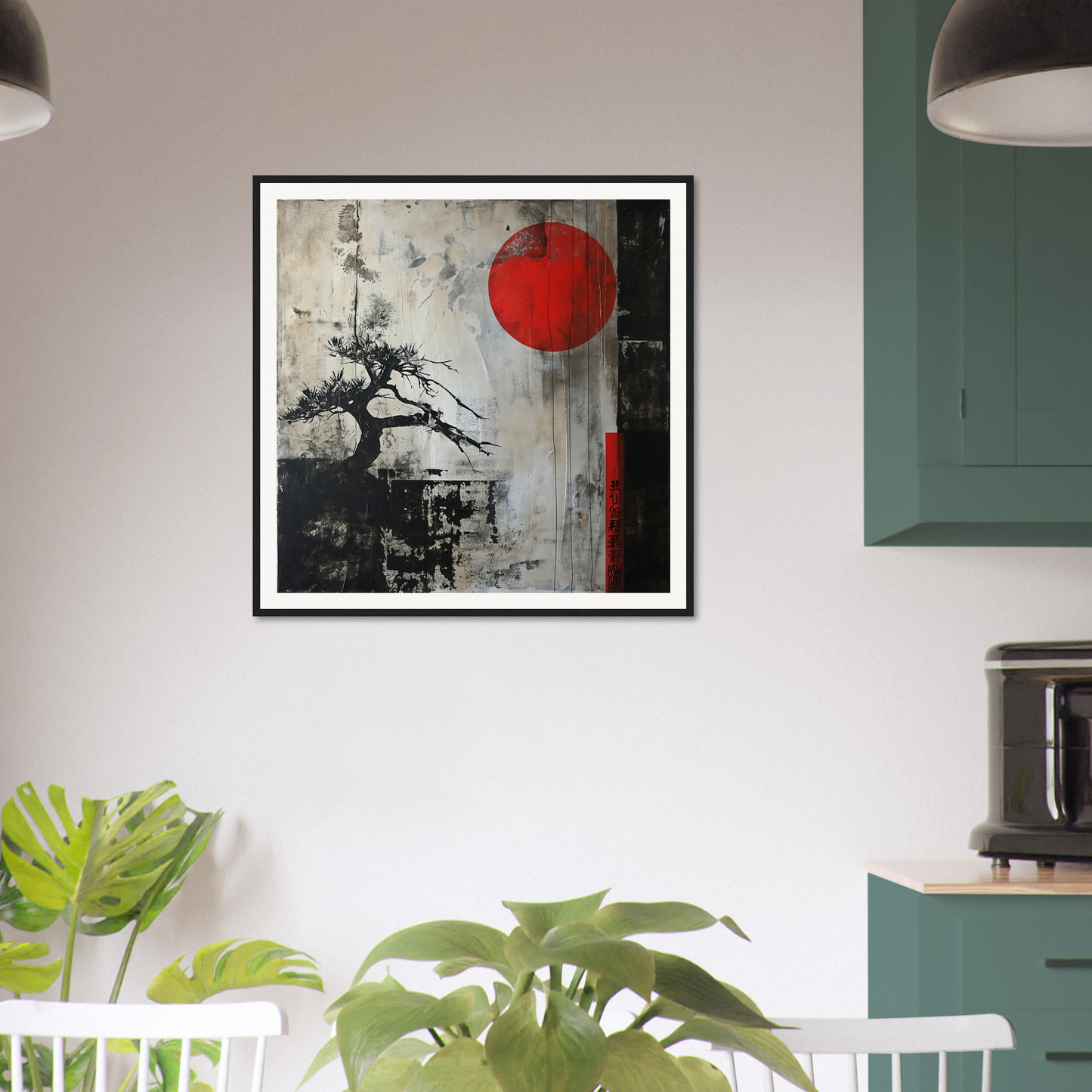 Our framed art captures the essence of East Asian aesthetics, featuring a solitary bonsai tree symbolizing resilience, grounded by the dynamic energy of a vibrant red sun. This duality of elements inspires harmony, reminiscent of Zen philosophy, and offers a poignant meditation on the passage of time.