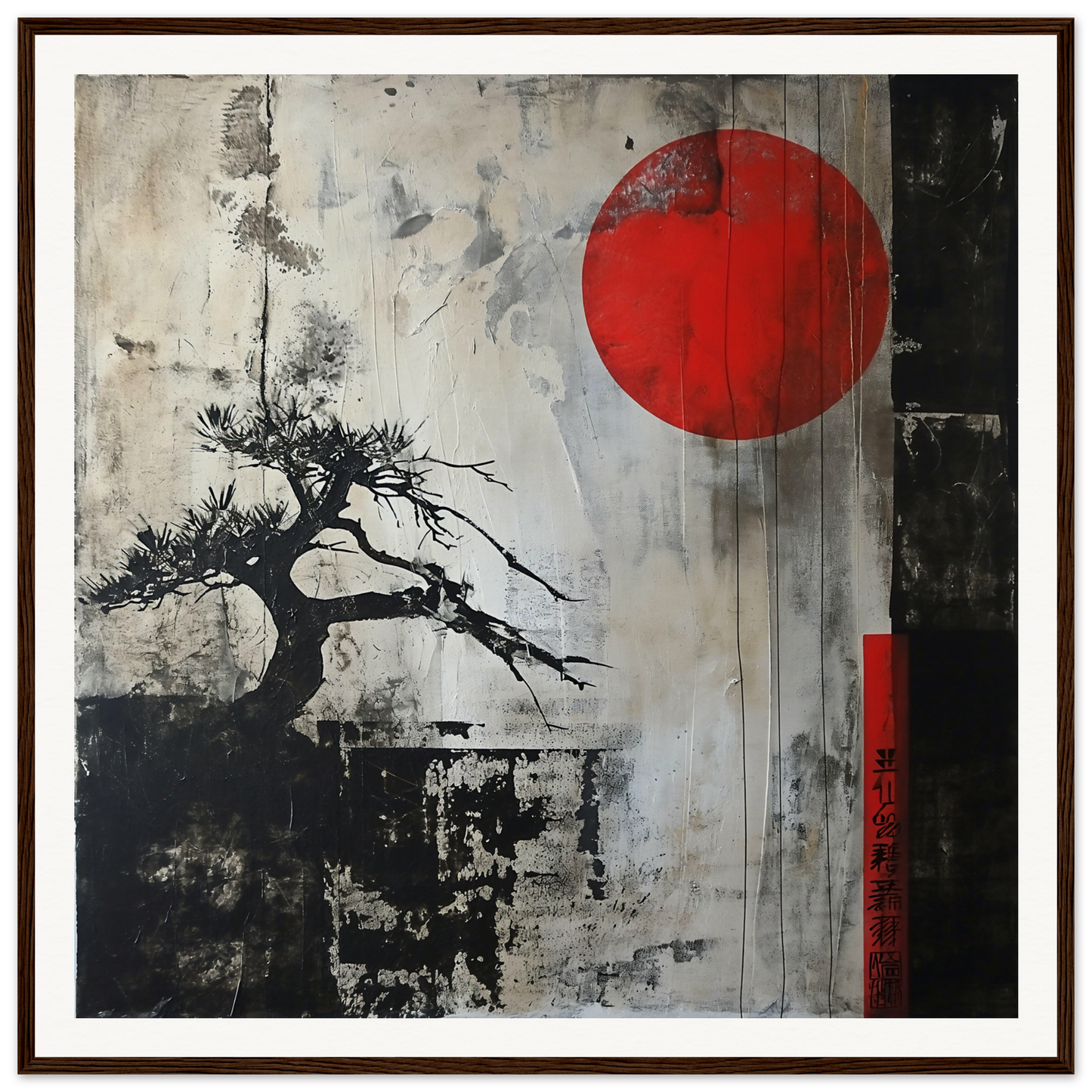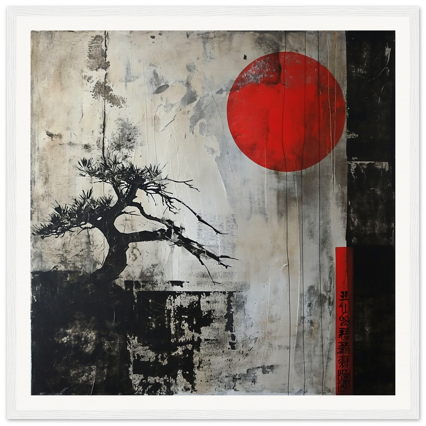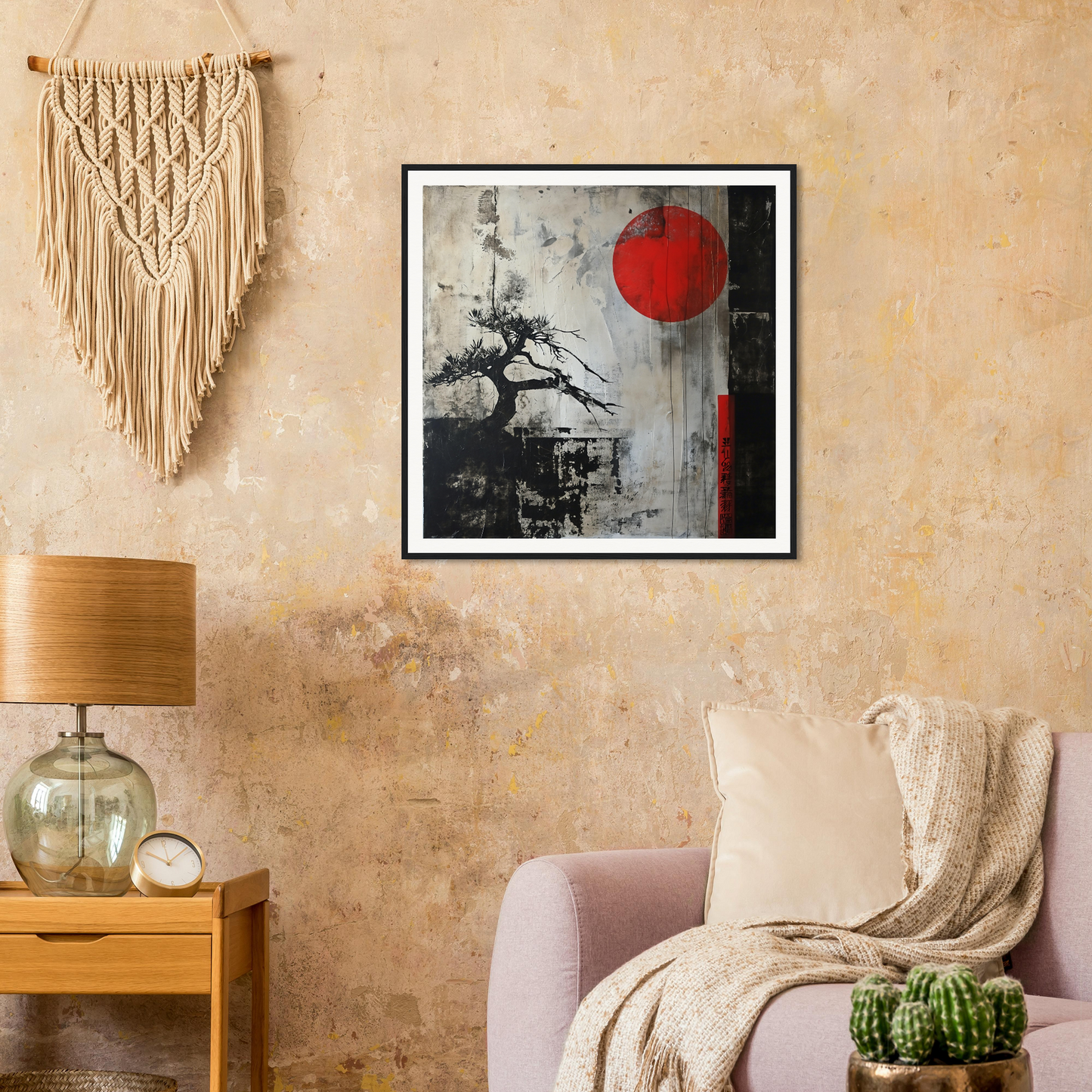 Our framed art captures the essence of East Asian aesthetics, featuring a solitary bonsai tree symbolizing resilience, grounded by the dynamic energy of a vibrant red sun. This duality of elements inspires harmony, reminiscent of Zen philosophy, and offers a poignant meditation on the passage of time.