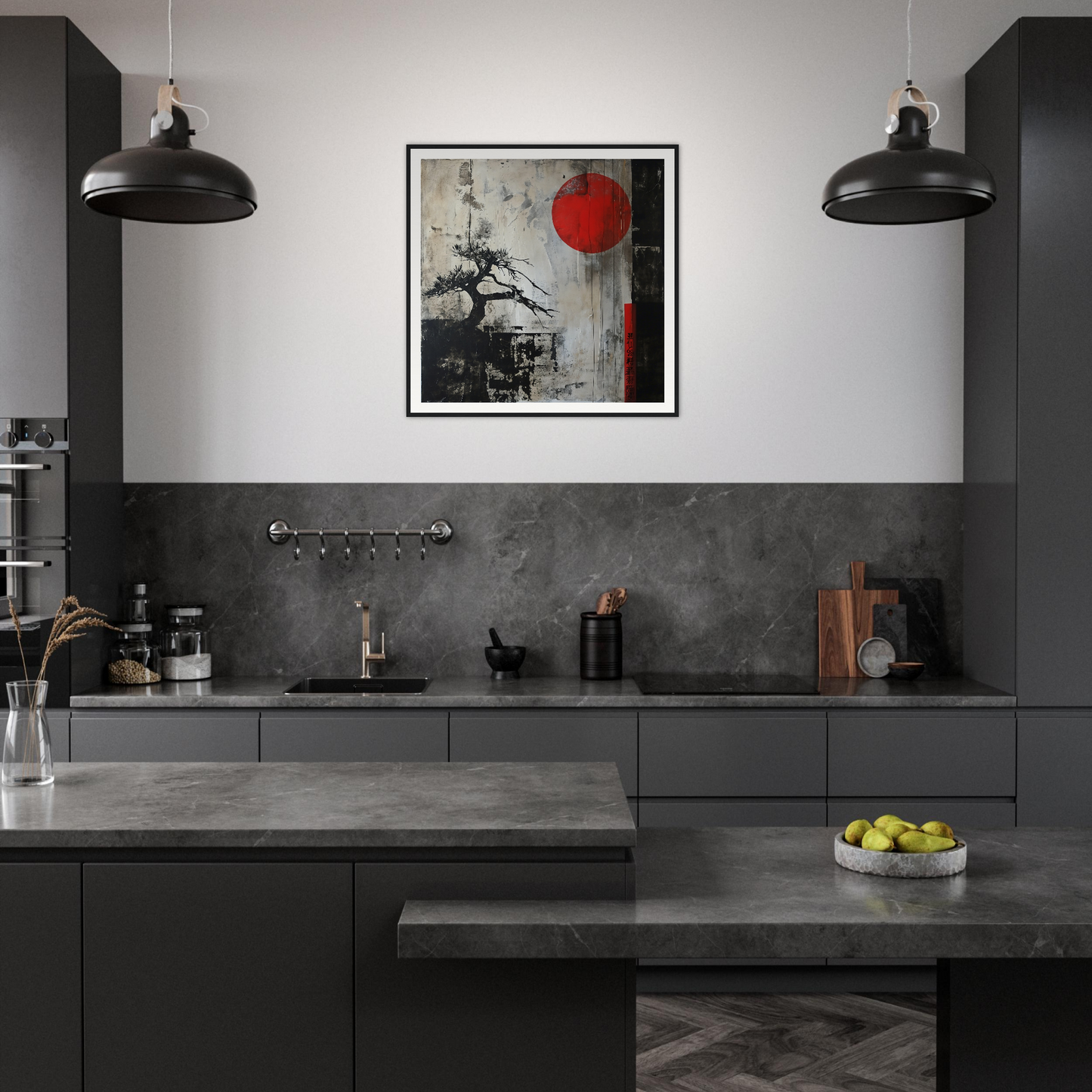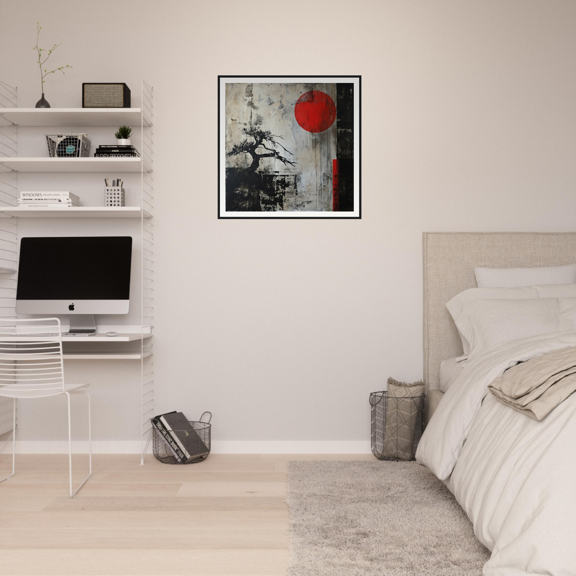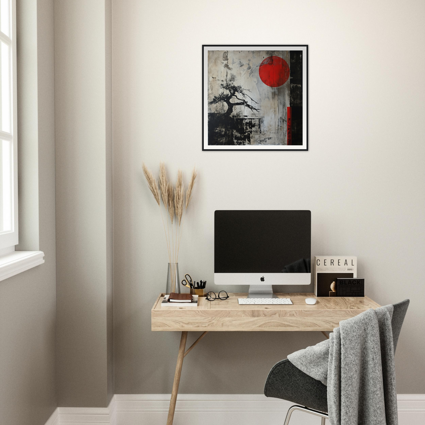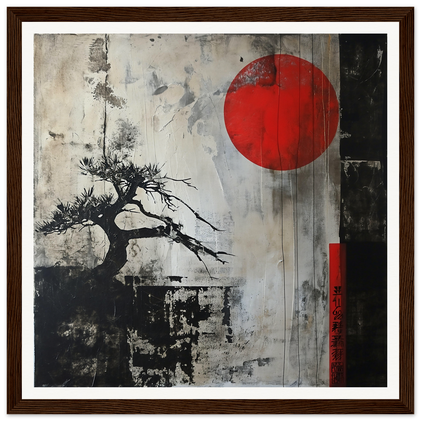 Our framed art captures the essence of East Asian aesthetics, featuring a solitary bonsai tree symbolizing resilience, grounded by the dynamic energy of a vibrant red sun. This duality of elements inspires harmony, reminiscent of Zen philosophy, and offers a poignant meditation on the passage of time.