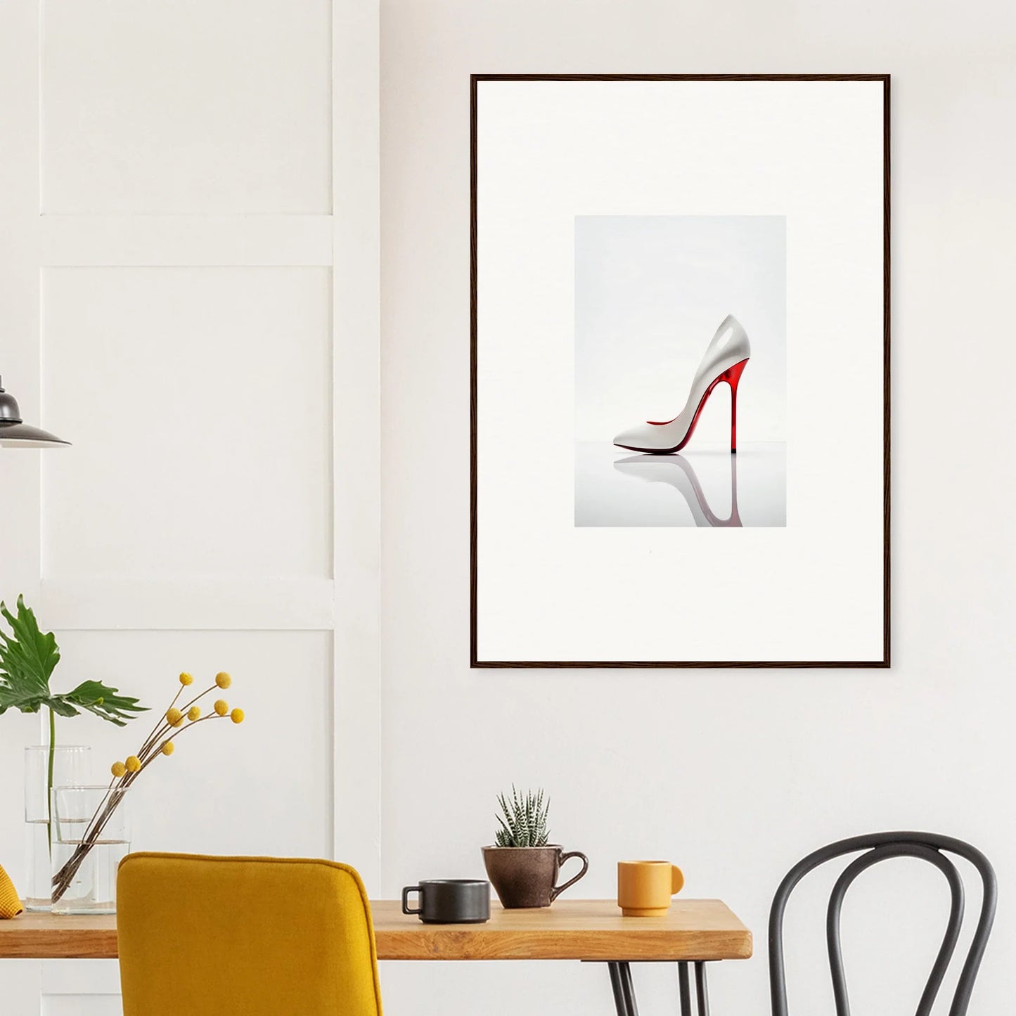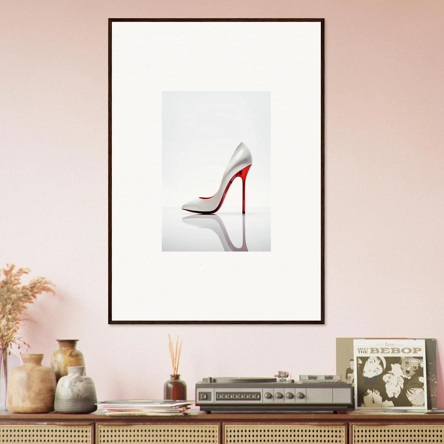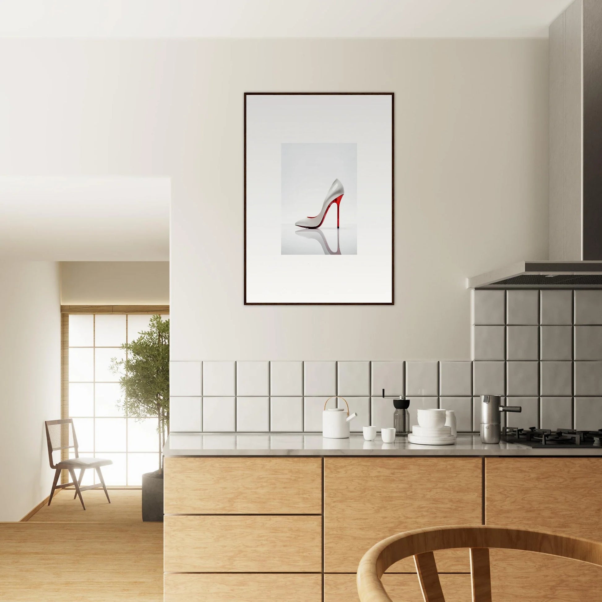 The artwork in our Stiletto Purist Symphony frame brings a harmonious blend of colors with a dominant red and complementary color palette, making it an eye-catching focus in any room. Its minimalist art style exudes luxurious and refined elegance, perfect for creating a focused, stylish mood.