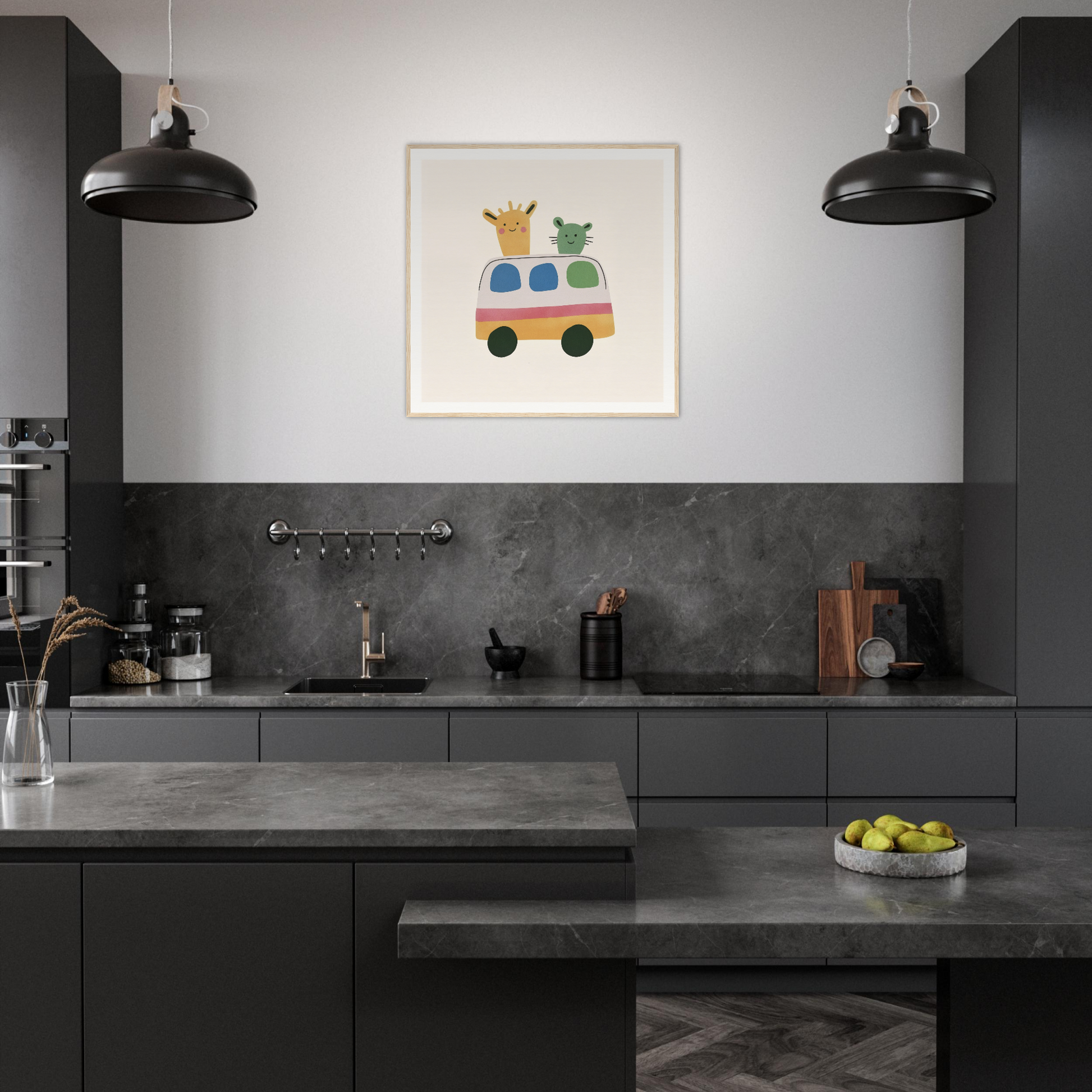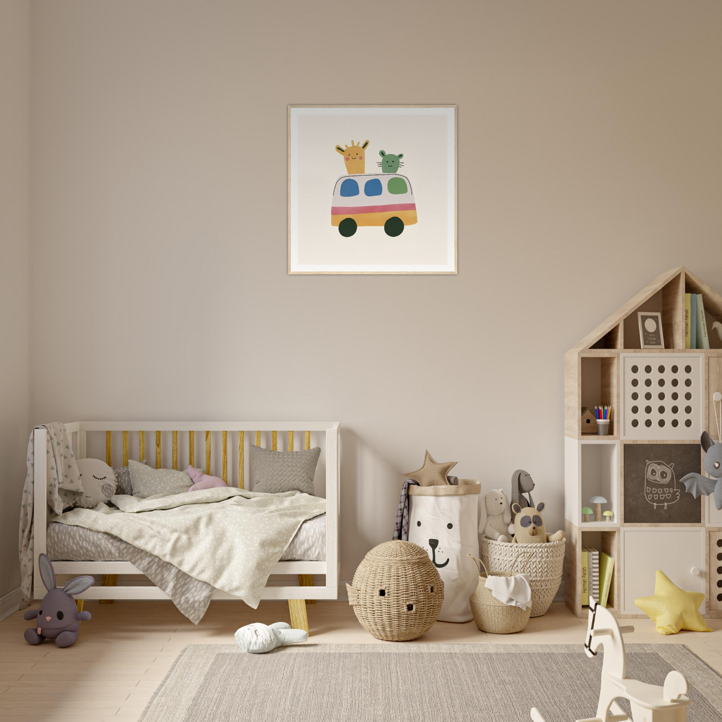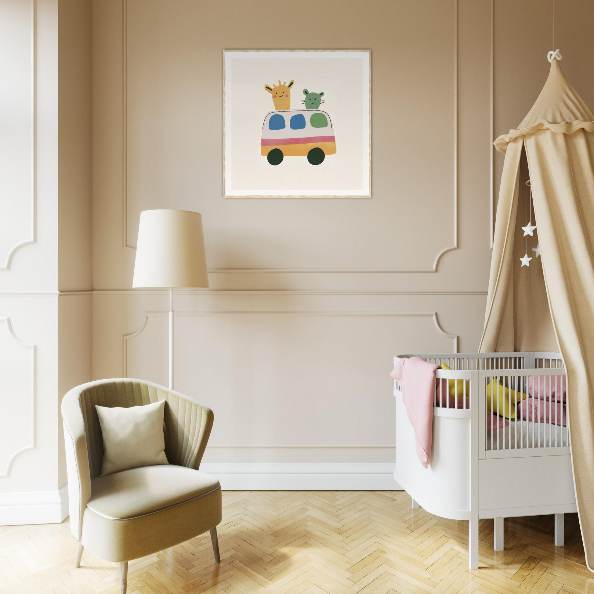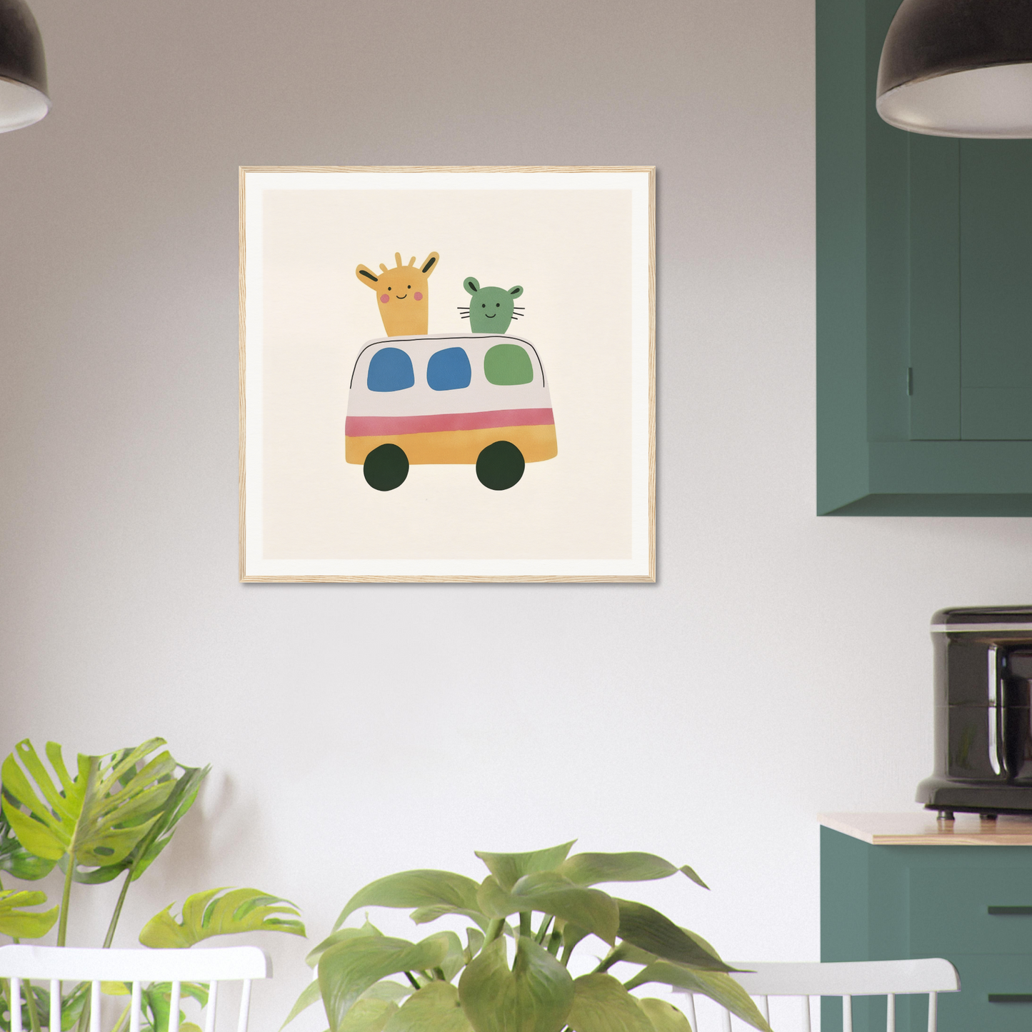 Our art boasts a pastel palette that invigorates: Soft Yellow is harmoniously blended into the bus and giraffe, setting a playful tone. The Creamy Off-White background offers a clean canvas that lets the vibrant characters shine. Accent colors like Pink, Green, and Blue add the perfect balance to this whimsical narrative. Each color is precisely chosen to stimulate creativity and joy.