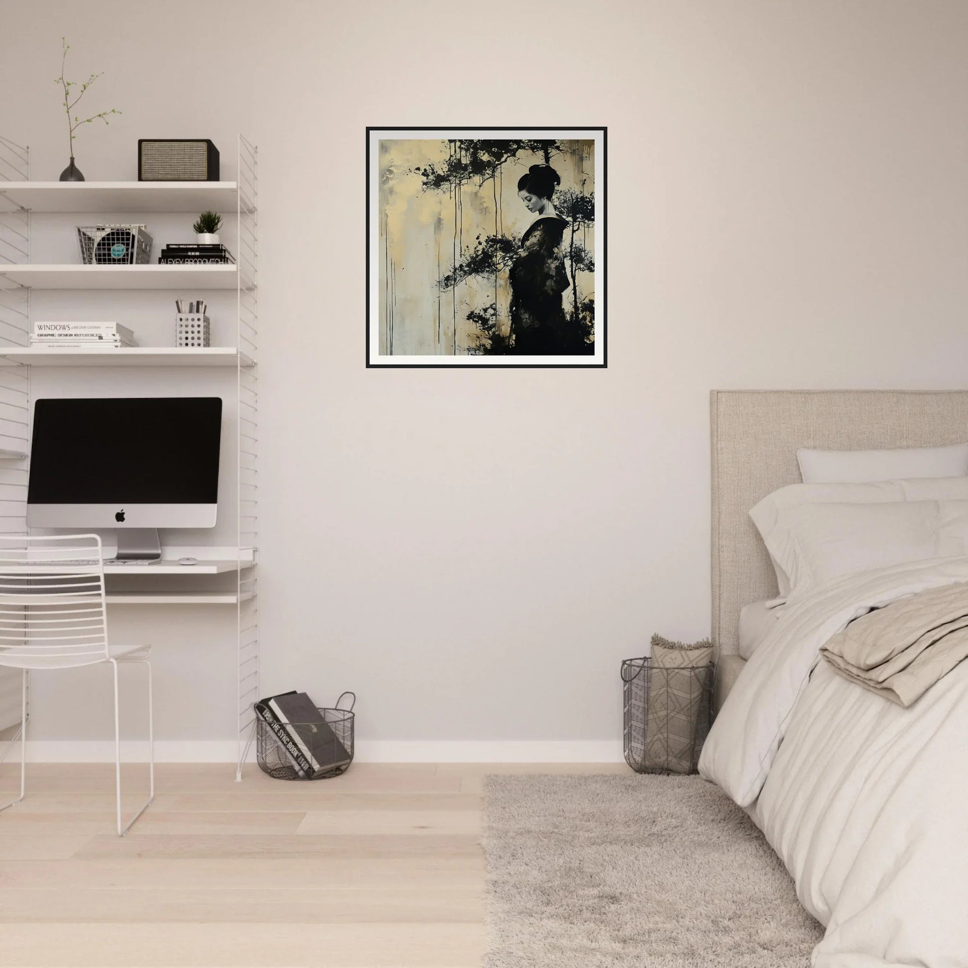 This artwork presents a solitary figure draped in a traditional kimono, evoking serene introspection and the whispers of nature's quietude. The abstract backdrop of ink-like foliage portrays the fluidity of existence, resonating with profound tranquility.
